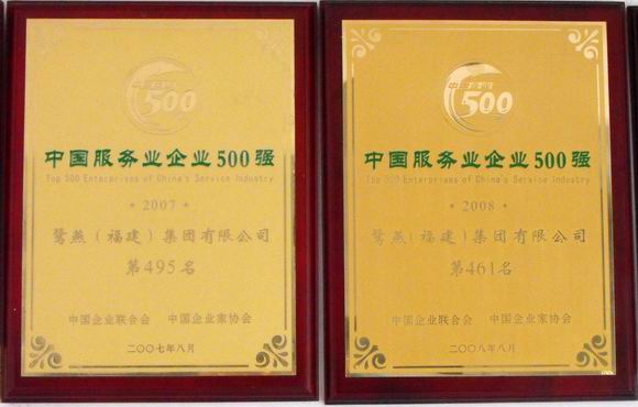 鷺燕集團又傳捷報,在榮獲了“市百強企業(yè)”、“市重點民營企業(yè)”、“湖里區(qū)十佳文明企業(yè)”之后,再次榮獲“中國服務企業(yè)500強”稱號,這已是鷺燕集團連續(xù)三年獲此殊榮。