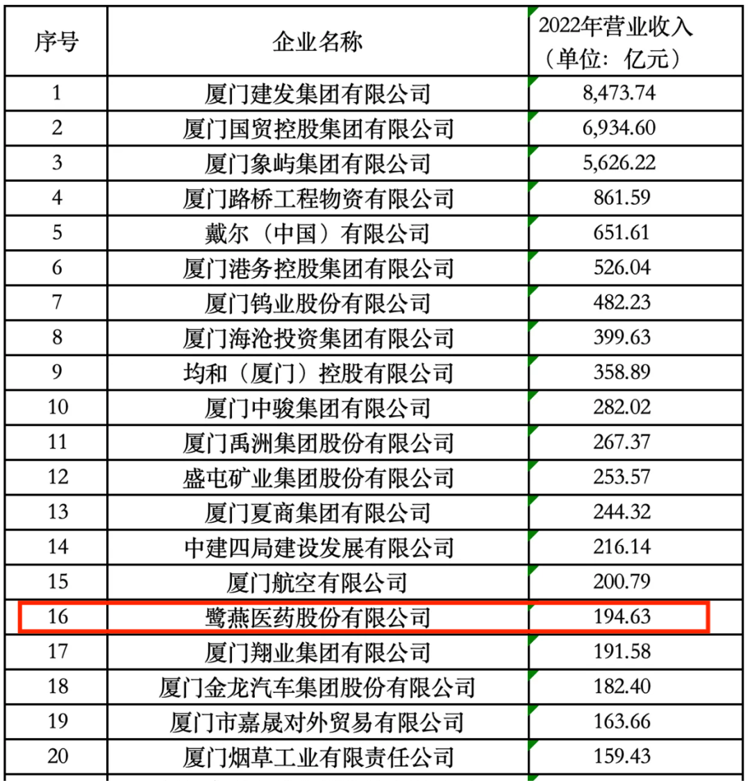 2023年11月25日,廈門企業(yè)和企業(yè)家聯(lián)合會發(fā)布2023廈門企業(yè)百強(qiáng)榜單,鷺燕醫(yī)藥股份有限公司榮列第16位!